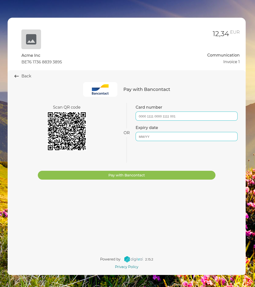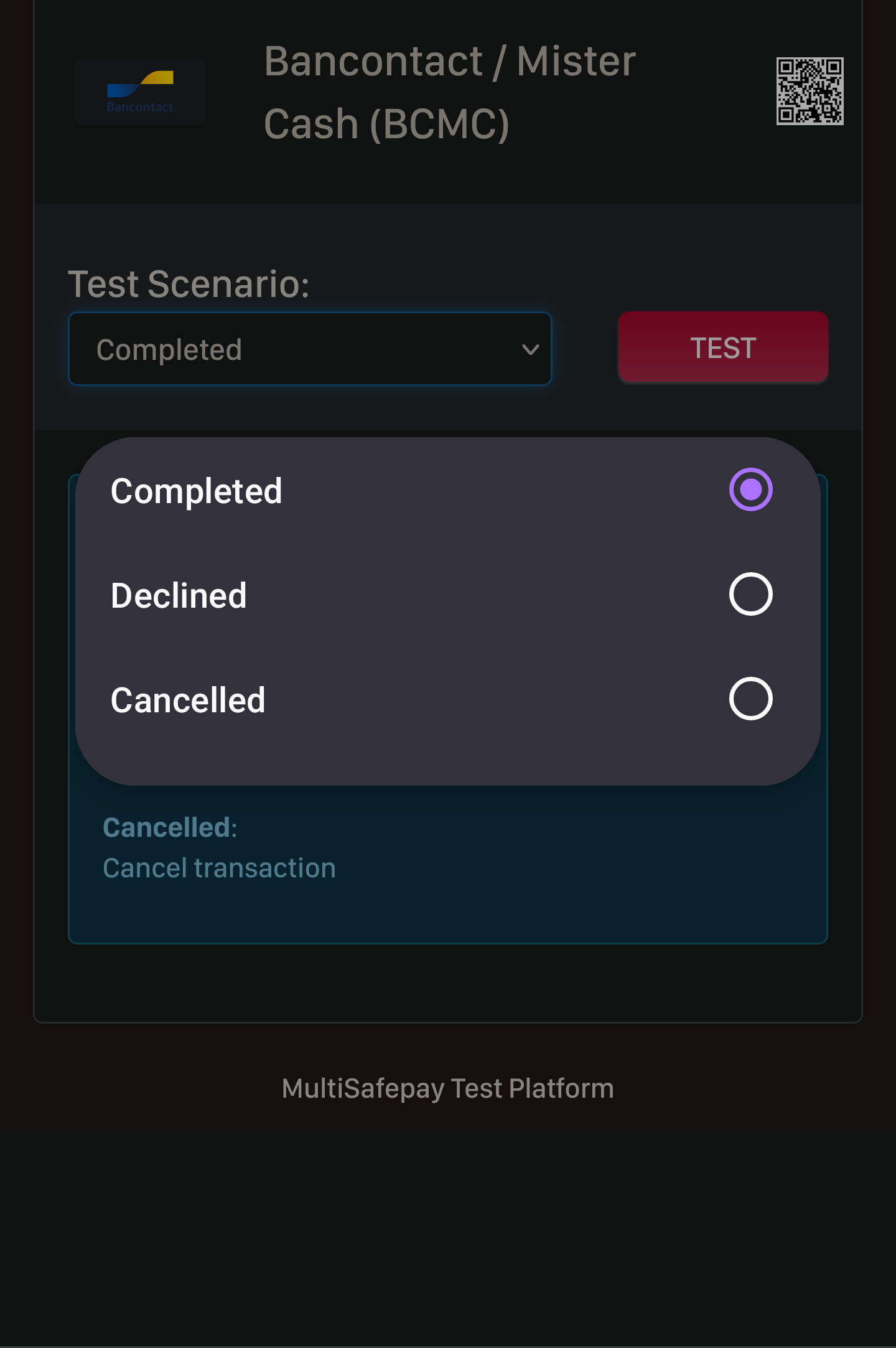 - Bancontact (Highly Recommended): The most stable and predictable way to test full redirection flows is using the Bancontact QR Code method in our test environment. Scan the generated QR code with your phone. You will be redirected to the acquirer's test environment, where a dropdown menu allows you to perfectly simulate specific scenarios (success, refused, error, etc.).